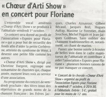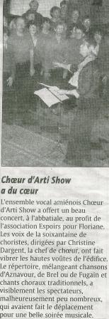 Vendredi 2 octobre dans l'Abbaye de Corbie, un concert mémorable avec la chorale Coeur D'artishow. Soirée émouvante par les chansons interprétées par le groupe, de Aznavour à Bécaud, la soirée fût un régal pour nos oreilles. Merci à Anne -Marie et Pierre Kauffman pour l'élaboration de ce spectacle.