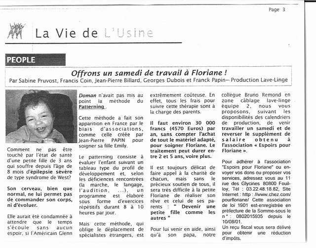 Publication dans le journal interne de l'entreprise où travaille mon papa (WHIRLPOOL Amiens) où bon nombre de personnes se sont mobilisées pour trouver le moyen de m'aider avec une très grande solidarité